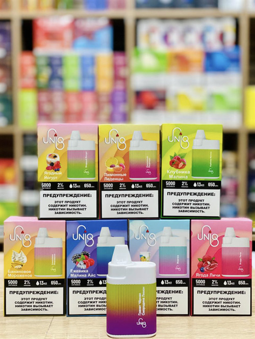 Uniq - 5000 затяжек Вкусы: Ежевика-малина-холодок Банановое мороженое Ягоды-личи Жвачка Клубника-малина Малина-лимон Ягодный йогурт Гранатовый сок-смородина-лимон Клубника-киви Лимонные леденцы Яблоко-холодок Виноград-холодок Манго-холодок Арбуз-холодок Ч