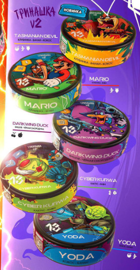 Снюс ТРИНАШКА V2 1 - DARK WING DUCK [ВИШНЯ ЧЕРНАЯ СМОРОДИНА] 2 - MARIO [КЛУБНИКА КИВИ] 3 - CYBER KURWA [КАКТУС КИВИ] 4 - TASMANIANDEVIL [КЛУБНИКА БАНАН КОКОС] 5 - YODA [КОКОС БАНАН]