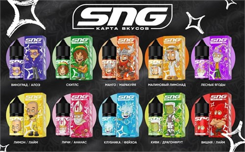 Жидкость SNG 7% Вкусы Яблоко-персик Черника Черника-кислая малина Чернично-малиновый лимонад Сахарная вата Табак кремовый Энергетик-холодок Киви-маракуйя-гуава Розовый грейпфрут Розовый лимонад